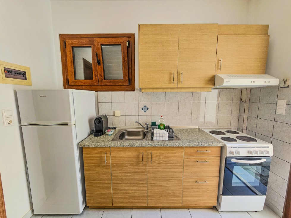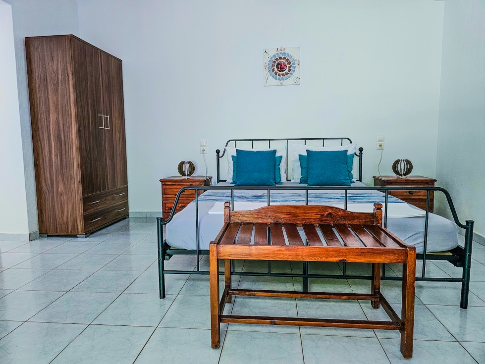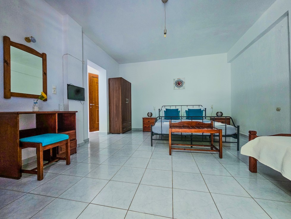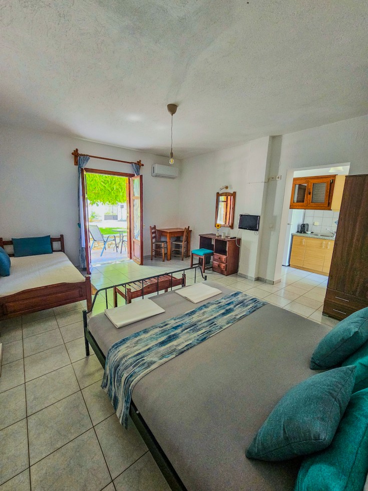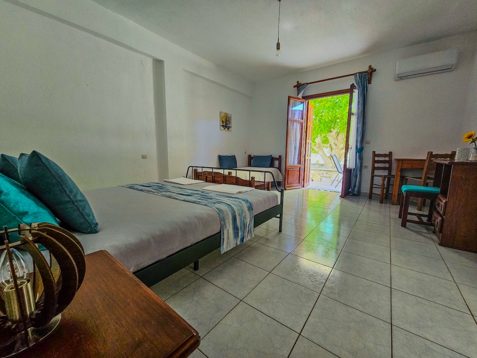 This bright and spacious ground-floor studio combines comfort, simplicity, and authentic island charm. The room features a comfortable double bed, an additional single bed, and plenty of space to relax after a day of exploring Skopelos. Large patio doors open directly to a private shaded terrace overlooking the peaceful courtyard and surrounding greenery — perfect for enjoying your morning coffee or an evening drink outdoors.