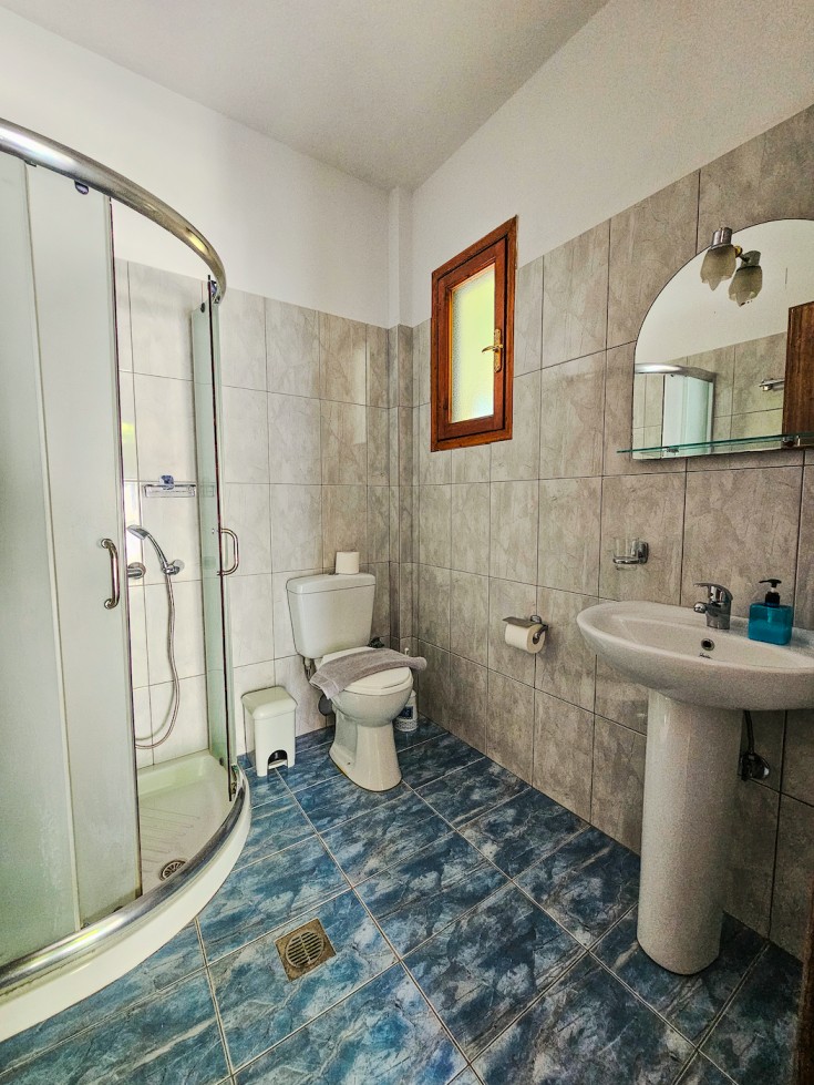 The bathroom is clean and practical, featuring a shower cabin and natural light from the small window. With cool tiled floors, air conditioning, and a calm setting on the garden level, this apartment is an excellent choice for guests seeking comfort and tranquility close to Skopelos Town.