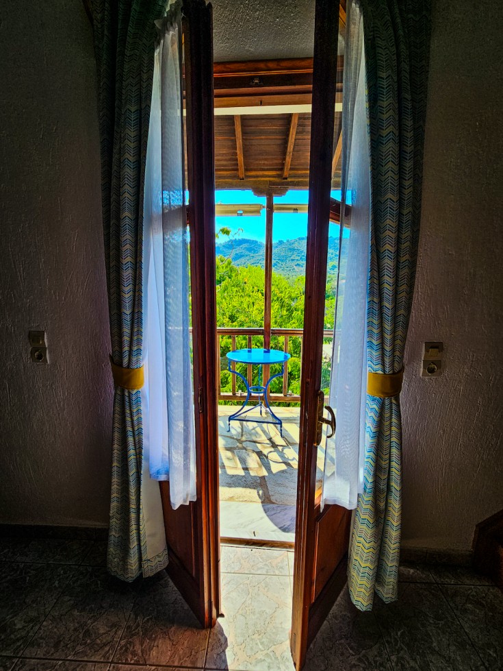 Outside, a private balcony with a traditional wooden roof and outdoor seating offers a peaceful place to enjoy your morning coffee while overlooking the garden and surrounding nature.