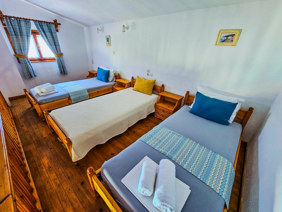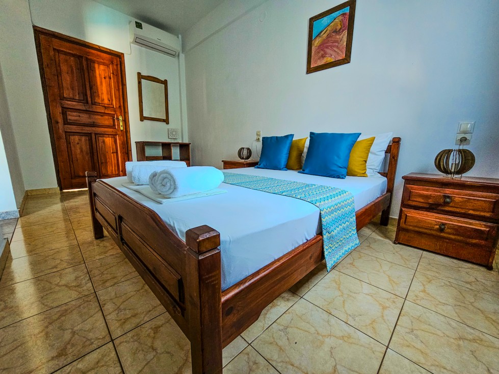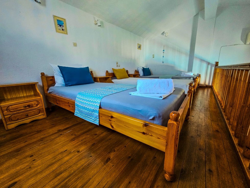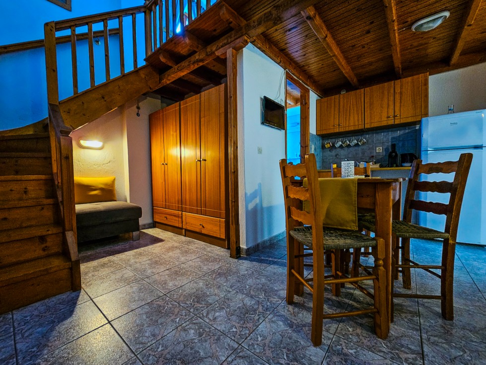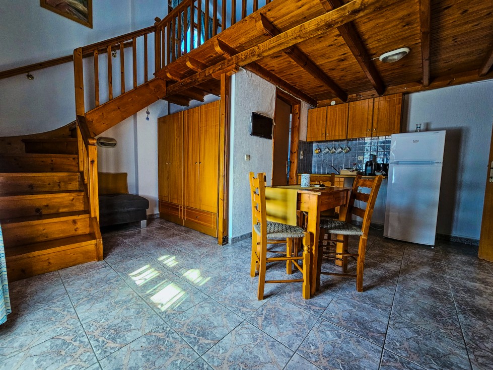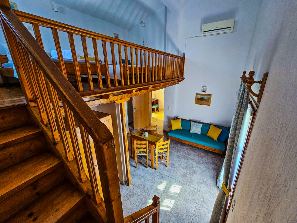 Apartment 8 is a spacious, two-level maisonette-style accommodation ideal for families or groups who want extra room and a cosy traditional atmosphere. The lower level features a bright living area with a dining table and a comfortable sofa corner, perfect for relaxing after a day at the beach. The wooden ceiling and staircase give the apartment a warm, authentic island feeling.